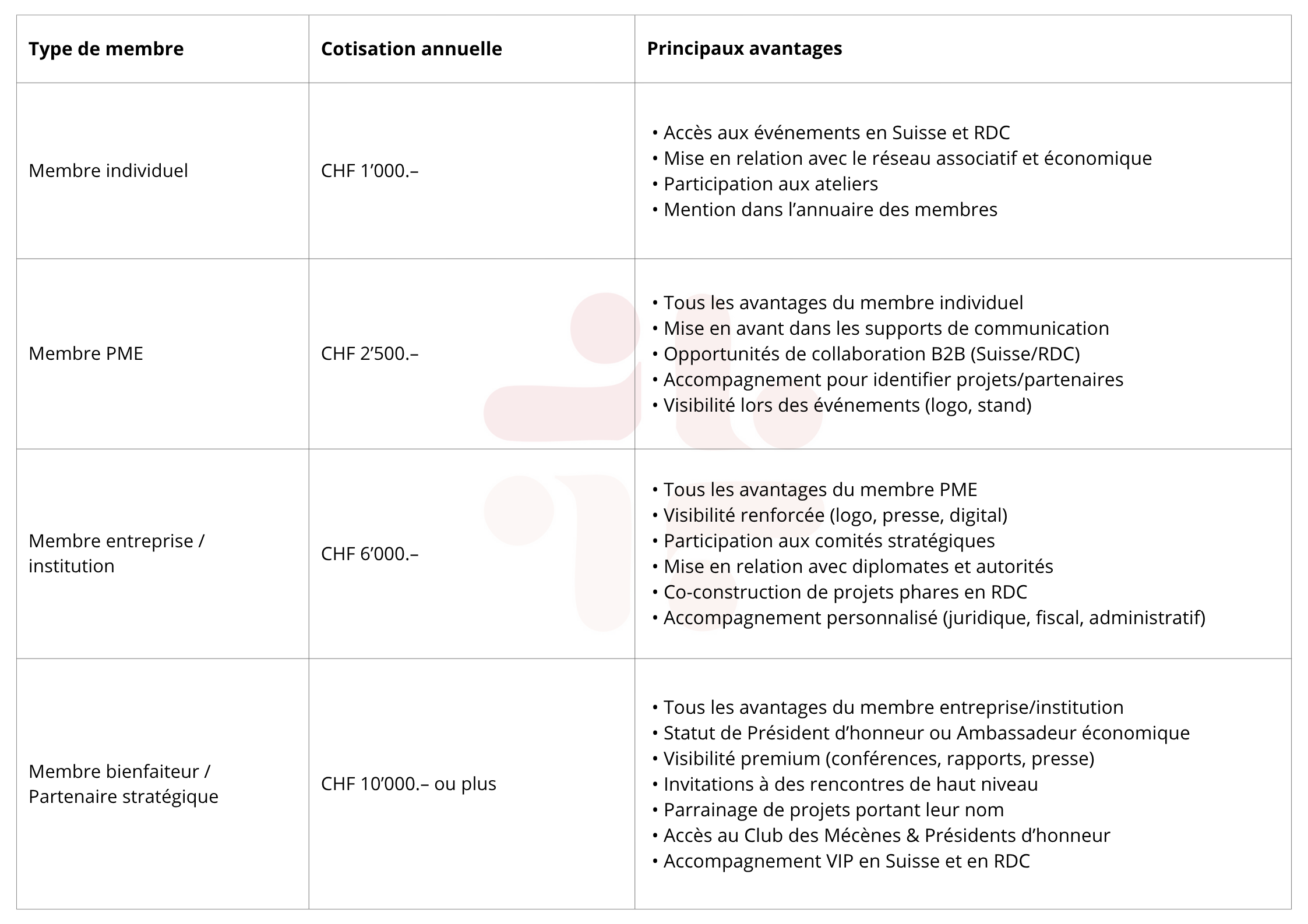Le tableau ci-dessous présente les montants et principaux avantages liés à chaque type de membre.